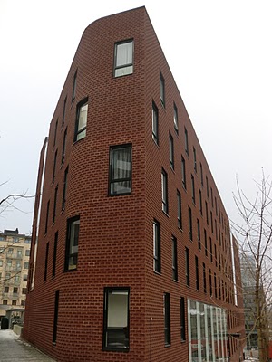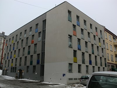 …og litt lenger ned i veien troner et annet studenthus som har bare én farge, men som til gjengjeld har en ganske sær form: