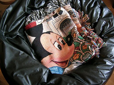 Pleddet var en gave fra samme person. Jeg takler ikke ull, så jeg elsker bomullspledd, og særlig med Mikke på!