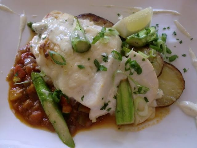 Så kommer maten, og så blir man helt stille, for det er så godt. Jeg spiste gratinert smørfisk med potetskiver, ratatouille (denne geniale grønnsaksretten er noe av det beste jeg vet), asparges og urtesaus. Anbefales!