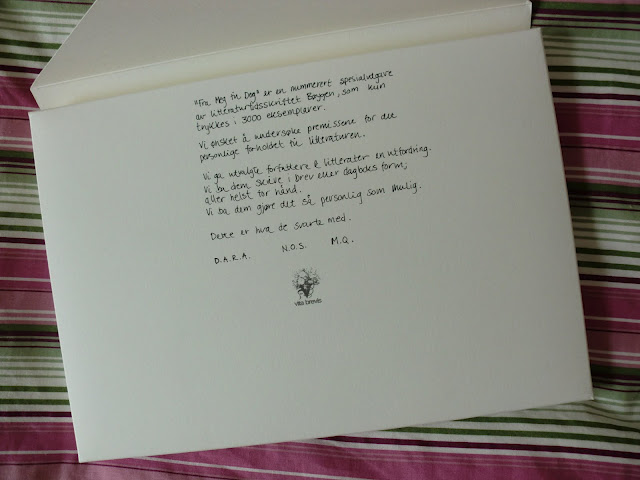 Som dere ser, ble bidragstyterne kontaktet og oppfordret til å skrive noe personlig, gjerne for hånd. For et spennende utgangspunkt! Konvolutten inneholder mange løse ark og et hefte merket «dagbok».