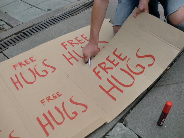 Jeg var en av dem som ruslet rundt med skilt og delte ut klemmer i dag, til tross for regnværet. Free Hugs Norway tok initiativ til en ekstraordinær klemmeaksjon i Oslo sentrum. Mange mennesker tok imot varme klemmer fra vilt fremmede, ofte med tårer i øynene og oppmuntrende ord. Alle trenger en god klem på dager som disse.