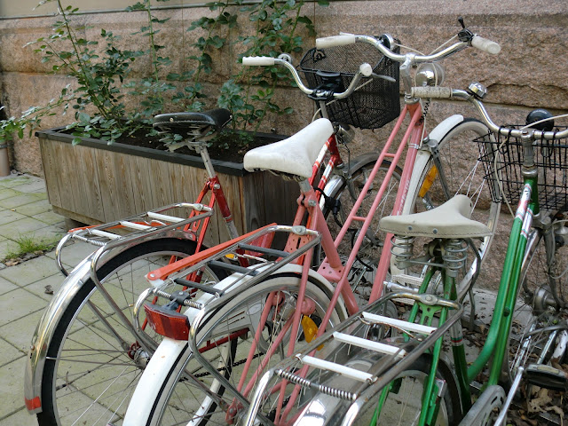 I en bakgård sto tre klassiske damesykler ved siden av hverandre. Slike syn gjør meg glad – lurer på om eierne kjenner hverandre, eller om de parkerer syklene sine side om side uansett, fordi de ser at det ser fint ut!