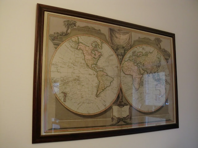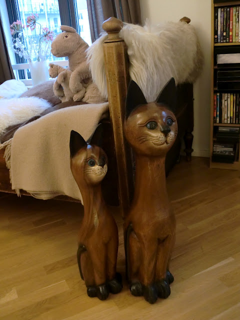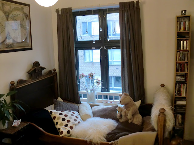 Dette er oppholdsrommet, med kjøkken og stue i ett. Rett frem står en antikk seng, med kenguru, kart og katter.