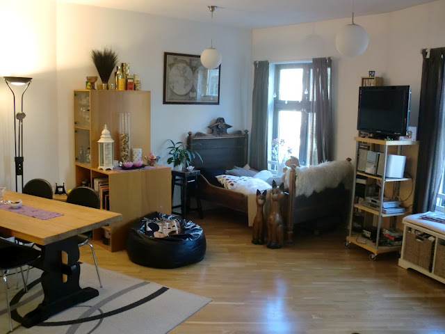 Til høyre finnes to nye sofaer, som vi fikk av snille bekjente. Tidligere fungerte sengen som sofa, og det var litt lite praktisk når vi hadde besøk. Det er fint å ha mange sitteplasser hvis man vil invitere til fest!