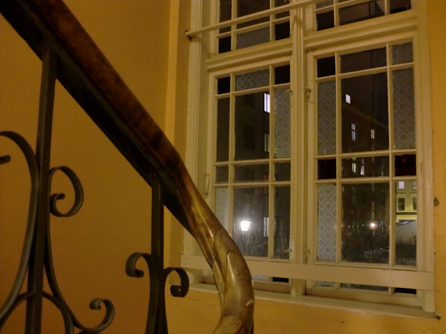 Torsdagskvelden tilbragte jeg hos en god venn som bor i en oppgang med fine vinduer og pen trapp.