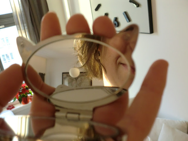 Den ultimate katt-og-kopp-kombinasjonen, hoho! Dette lommespeilet beundret jeg i et halvt år før jeg kjøpte det. Plutselig var det nedsatt med førti prosent, og dermed havnet prisen under bruke-på-seg-selv-smertegrensen, og min materialistiske lykke var stor. Samme dag fant jeg dessuten Mummipappa til halv pris, og han hadde jeg også ønsket meg lenge, så pusen og pappaen ble min julegave til meg selv. Det er lov, vet dere, å belønne seg selv innimellom.