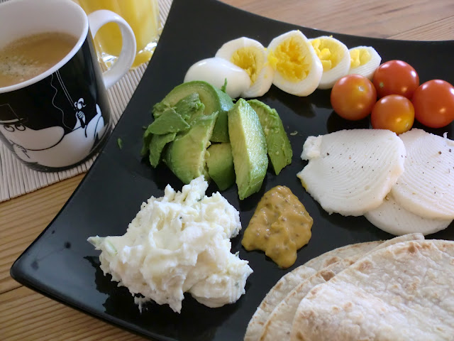 …og så blir man med solen ut på kjøkkenet og spiser god frokost (for eksempel en med kokt egg, fiskepudding, lefser, potetsalat, grønnsaker, sennep, cherrytomater, avocado, juice og kaffe i Mummikopp)…