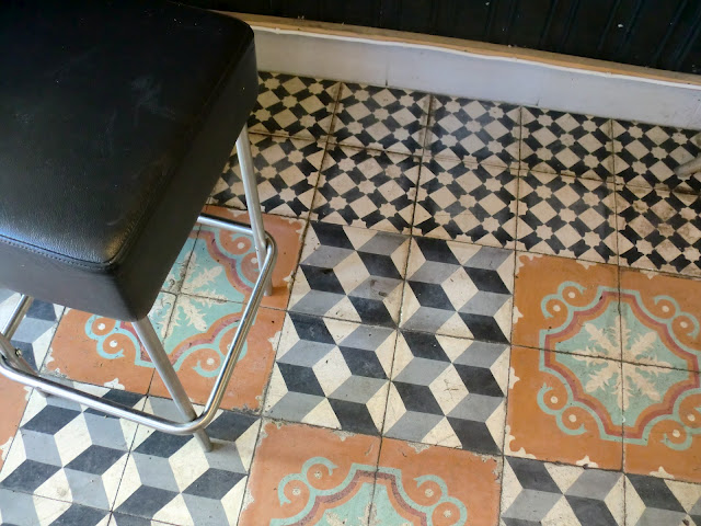 Gulvet fortjener litt oppmerksomhet i seg selv; man tråkker rundt på fine figurer og mønstere, som gir lokalet liv og dybde – og så har man noe å se på hvis man blir forlegen og slår blikket ned dersom gutten bak disken er kjekk.