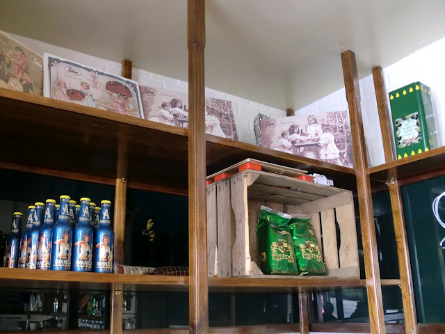 Produktene har gjerne fine innpakninger, og står stablet fra gulv til tak sammen med nostalgiske bilder.