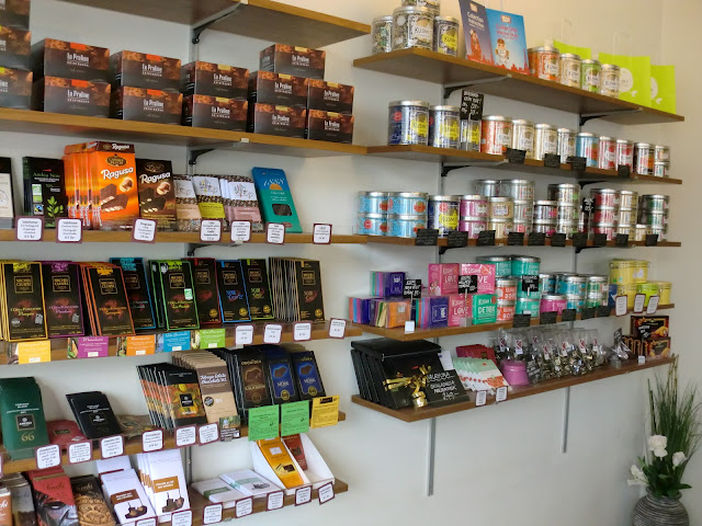 …med et stort utvalg av importsjokolade og te i fine bokser…