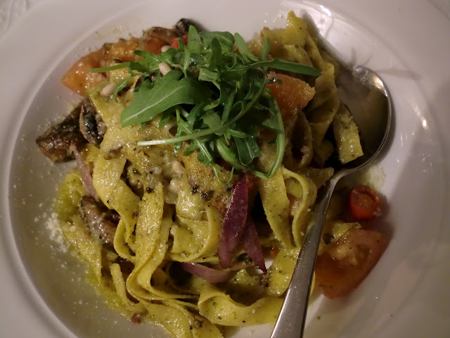 Hjemmelaget båndpasta med ost og grønnsaker og pinjekjerner og sånt, det passer meg ypperlig.