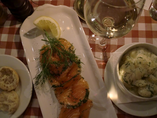 Selv om menyen var av oversiktlig størrelse, var det vanskelig å bestemme seg, for alt virket så godt! Jeg bestillte til slutt laks med kremet potet, dill og sitron. Godt brød og et glass hvitvin ved siden av ble prikken over i’en.