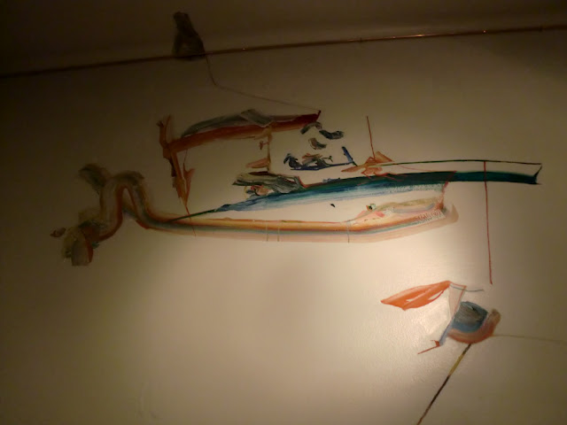 …og i første etasje er det malt maritime motiver oppunder taket.