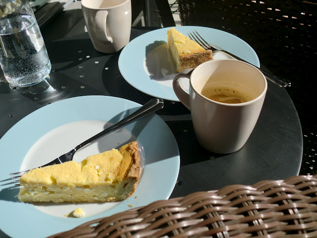 Det er hyggelig å starte dagen sammen, og vi hadde rusleplaner, så vi spiste oss mette og glade. Dessuten: Frokostdessert! Hverdagsluksus! Moren hans hadde bakt ostekake med hytteost og sitron, og det ble en frisk og fin avslutning på kosefrokosten. Kaffe og kake i solen på balkongen: Ja, takk.