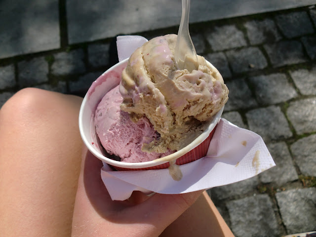 Vi spiste is; en selvfølge på en slik dag! To kuler på meg. Jeg hadde bare knær og frøs ikke det minste.