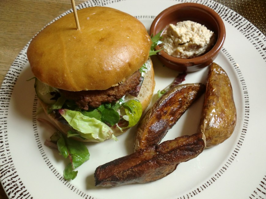 Vi bestilte hver vår burger. Ingen av oss spiser vanlige burgere, men falafelburger var midt i blinken for oss! Servert med potetbåter og hummus. Superlunsj!