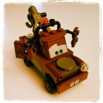 Mater (fra Disneyfilmen Biler) i selvbygget legoversjon, en skål med pene drops, en dramatisk himmel.