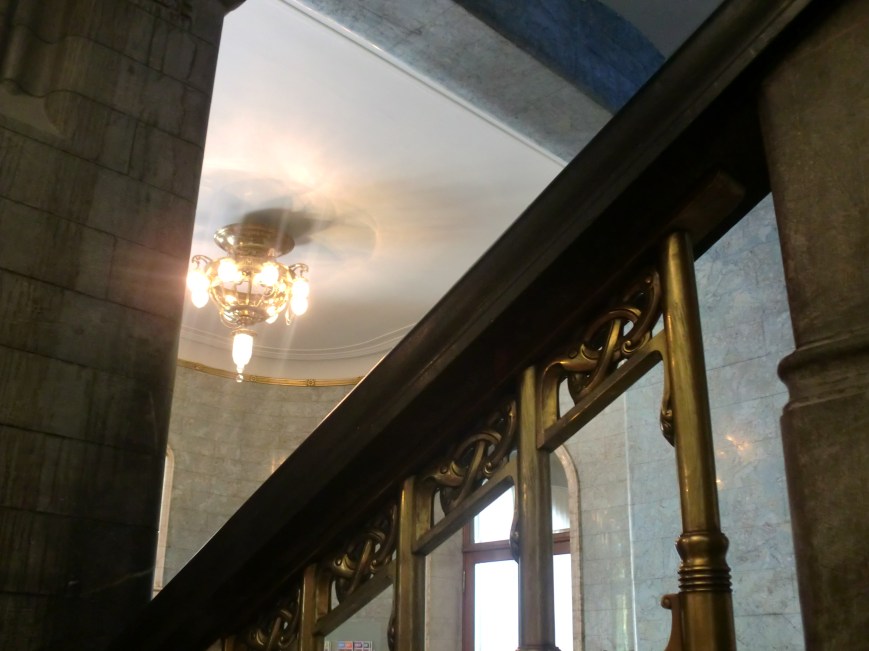 Det var like fint på innsiden. Foajéen var full av marmor og gull og glass og tunge trapper.