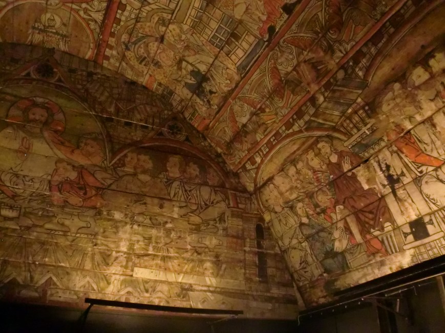 …og til stavkirker med utsmykkede tak som oppbevares temperert for at de skal holde seg best mulig (dettte rommet var varmt som en badstue!).
