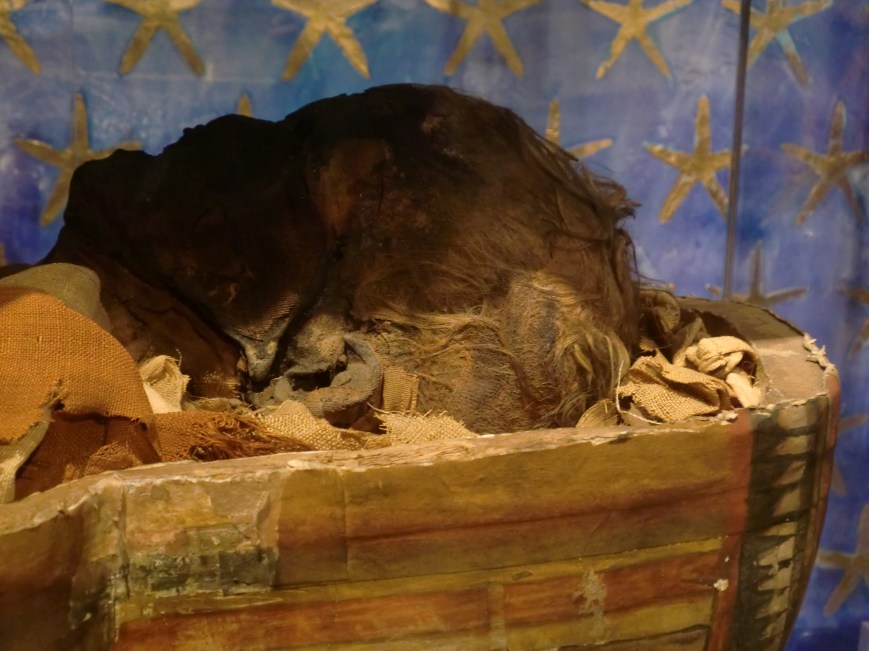 …og inne én av dem lå det en vaskeekte mumie. Åhå! Man kan fortsatt se håret på hodet til denne kvinnen, for så godt bevart blir de balsamerte menneskene. Slikt er nesten ikke til å tro.