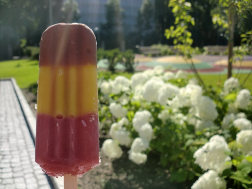 Da var det på tide å gå ut i sola igjen, og unne seg en is i den nye parken utenfor museet. Vi satt på en benk og snakket om alt det interessante vi hadde sett, og saftisen smakte fortreffelig.