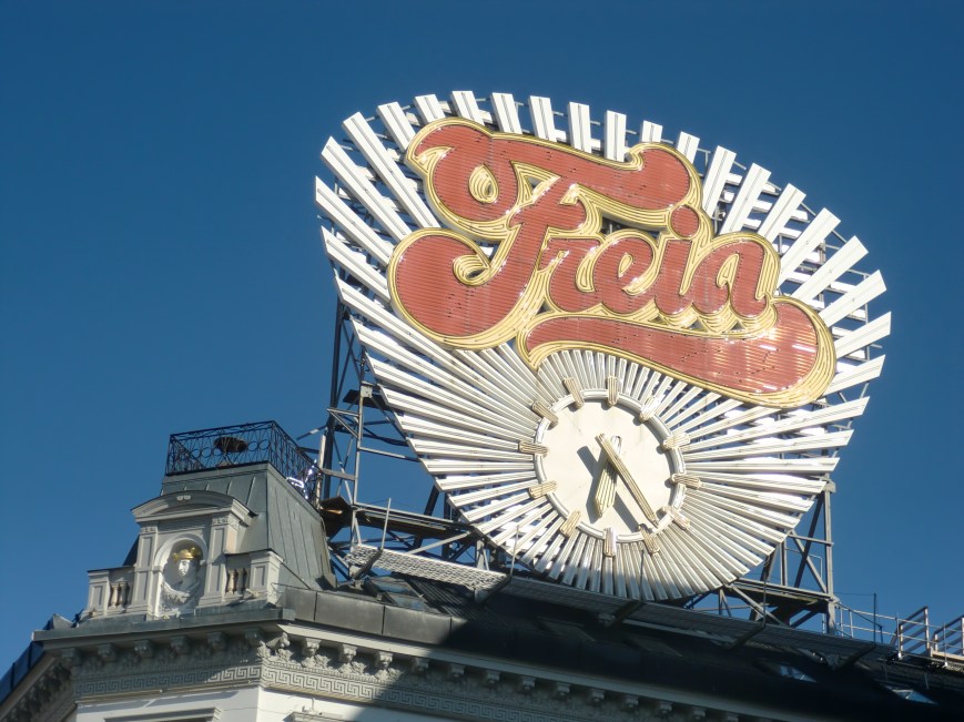 Etter kaffen tok vi bena fatt igjen. Vi ruslet litt på Karl Johan på dette tidspunktet, for det gjør man jo gjerne når man besøker en by man ikke kjenner; man utforsker de områdene som er mest turistifiserte og upersonlige, fordi de er mest kjent og mest tilgjengelig. Jeg pleier å unngå Karl Johan ganske aktivt, for det er ingenting der som man ikke finner andre steder i byen i en hyggeligere ramme og med en riktigere pris – foruten én ting, som jeg husker godt fra klasseturer til Oslo på ungdomnsskolen: Freia-skiltet på Egertorget. Knips! Klassisk Oslo-turisme!