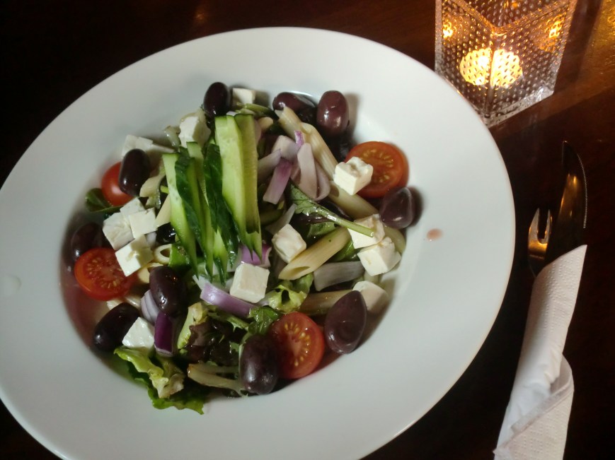 En gresk salat var en fin form for lett, ganske sen middag etter en innholdsrik dag. Nå begynte det nemlig å skumre, så betjeningen tente lyset på bordet vårt, og vi spiste sakte med senkede skuldre.