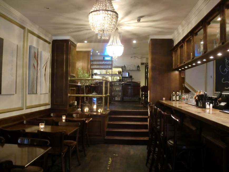 Vi gikk og gledet oss over det fine været en god stund, og beveget oss vestover i byen, for etterhvert ble vi klare for middag. Etter å ha stått og gått mye hele dagen, var det godt å finne seg til rette i en myk sofa hos The Broker på Majorstua. Det er et slikt sted som jeg har passert igjen og igjen nesten uten å registrere det, for fra utsiden ser det ut som en litt sliten og ganske uninteressant bar. Inne er det riktignok mye hyggeligere enn man skulle tro, for der er det mørke tregulv, fine lysekroner i taket og kunst på veggene.