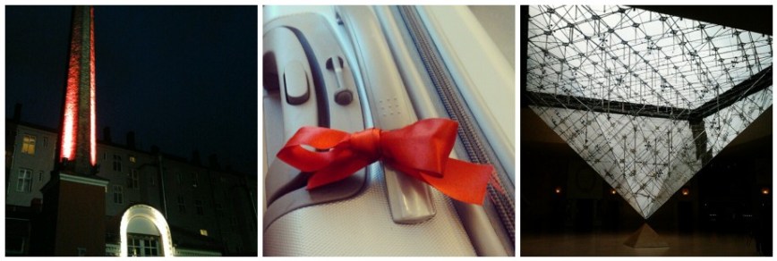 Stilige nattelys på vei hjem fra fest, en koffert som er klar for Paris, en av glasspyramidene i Louvre.