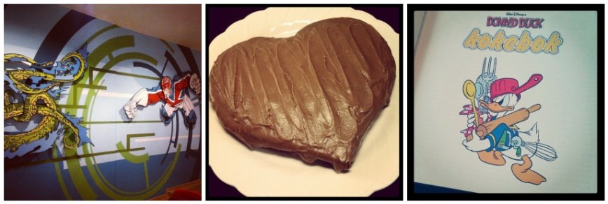Tøff veggdekor i et auditorium, en rømme- og kaffekake jeg bakte til kveldsbesøket, en søt kokebok med oppskrifter fra Andeby. «Om du ikke vet hvordan ovnen fungerer, så spør en voksen om hjelp»…