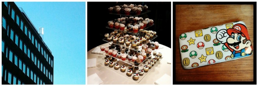 En blå himmel som speiler seg i vinduene på et bygg i nærområdet, et cupcake-fjell på kundekveld, lommeboken som jeg kjøpte i New York i fjor sommer.