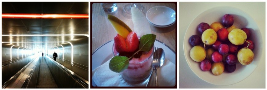 Tunnellen til togene på Oslo S, fin dessert på restaurant, et fat med plommer (som nå er spist opp).