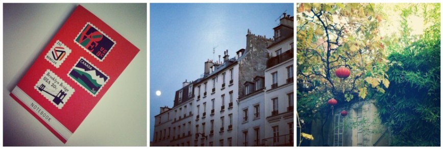 En pen bok til å skrive Paris-notater i, månen over husene i det nye nabolaget, båkgården min.