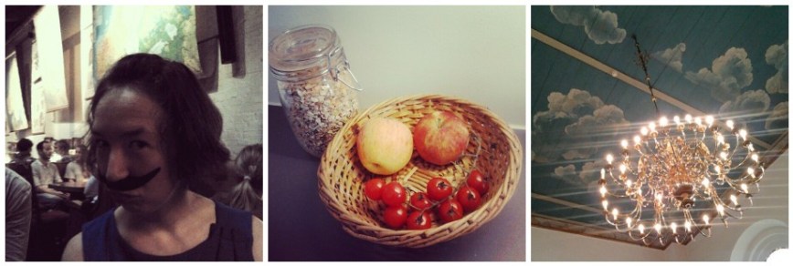 Meg på Mekken (jeg inviterte folk til en siste skål og klem før jeg flyttet, og en av barndomsvenninnene mine dukket opp med bart til meg!), frokostkroken hos Jonasflotte, kirketaket da jeg var i bryllup.