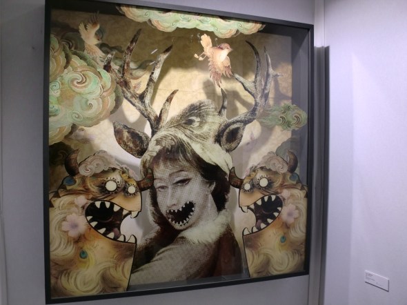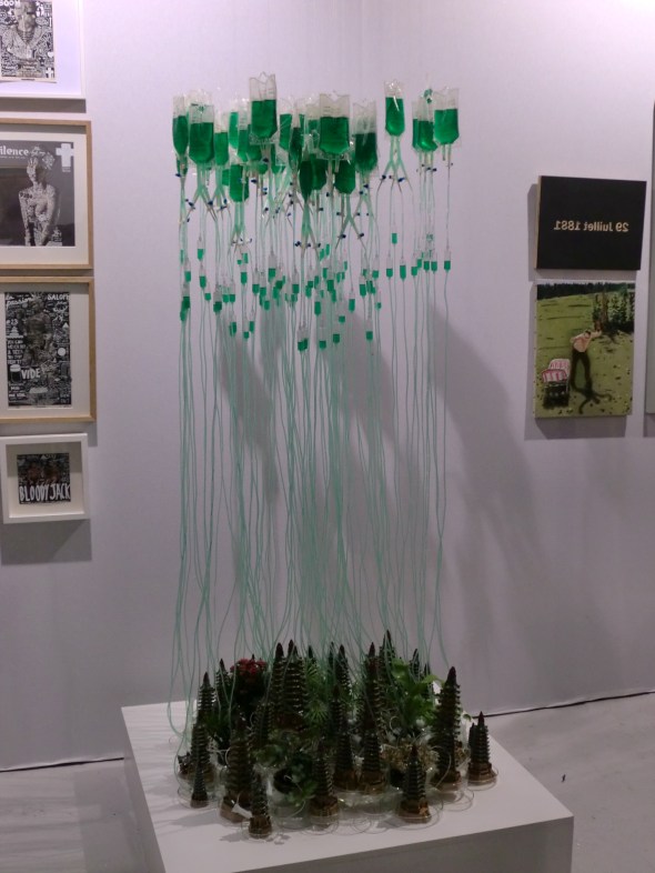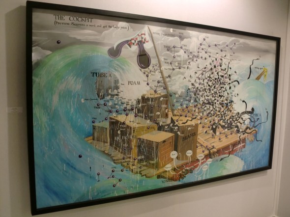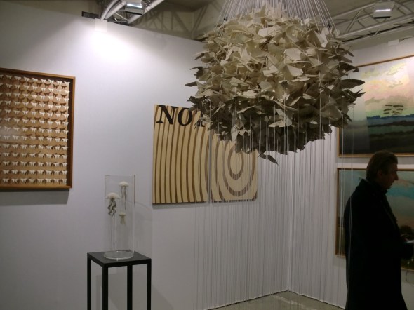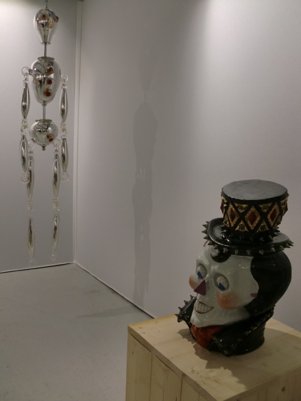 Vi tar en titt på selve kunsten, da. Utvalget føltes litt som det pleier å gjøre på Høstutstillingen i Oslo! Den rakk jeg ikke få med meg i år, så det føltes bra å få en lignende opplevelse her. Utstillingen besto altså av både installasjoner, skulpturer, foto, malerier, trykk… Omtrent alt, egentlig. Fra gulv til tak. Ungdommelig, uforutsigbar, energisk samtidskunst. Alltid interessant, synes jeg!