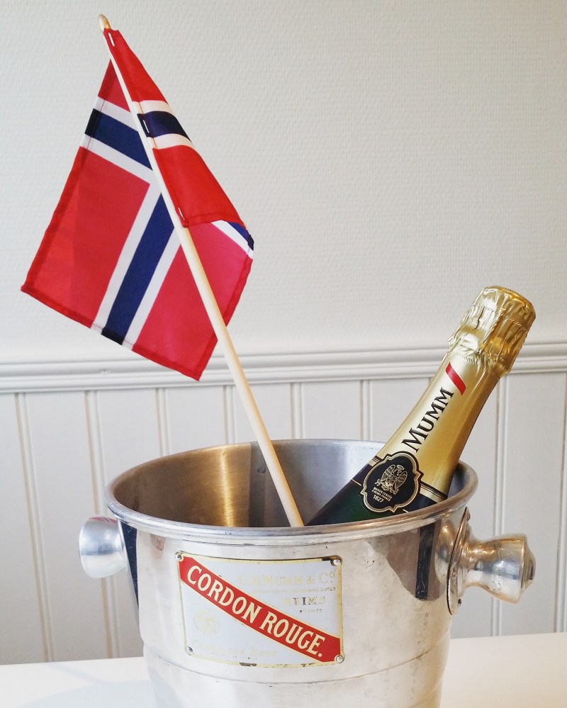 Jeg er utstyrt med flagg, vintagekjole, sprudlevin og stor, barnlig glede. I dag skal jeg svinse og smile og synge og skåle med fine folk rundt omkring i Oslo, og kanskje være litt ekstra lettrørt ettersom vi bodde og feiret i London i fjor.