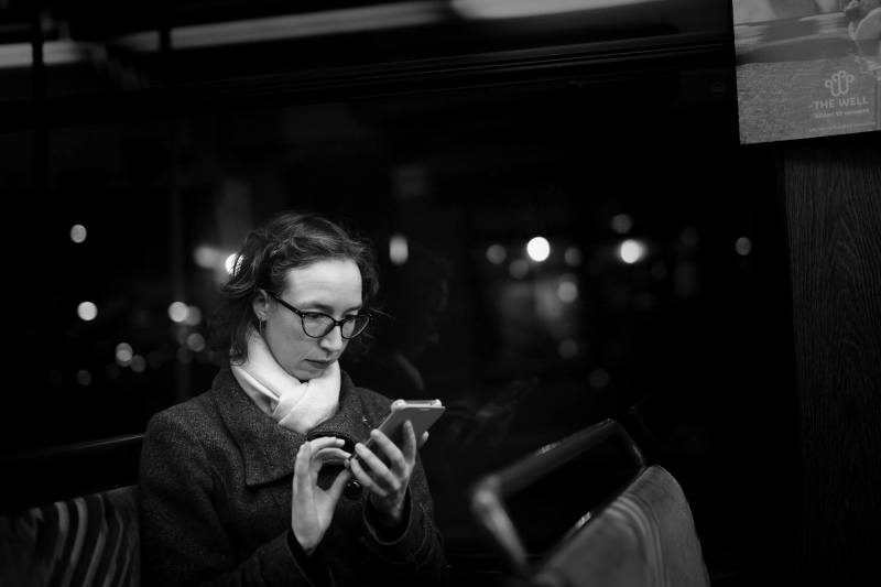 Klokka var halv elleve på en fredagskveld, og jeg var på vei hjem etter ei vakt på vinbaren. Litt sliten, kanskje. Jeg vet akkurat hva jeg holdt på med, for det første jeg gjør etter jobb er å sjekke om det har dukket opp noen nye leiligheter i det lagrede søket mitt på Finn. Da ser jeg tydeligvis slik ut. Analyse-fjeset. Beliggenhet og størrelse. Felleskostnader og oppbevaringsplass. Kvadratmeterpris og våtromsbevis. Vurdere, sammenligne, mentalt møblere. Er det plass til gjesteseng langs den veggen der? Får man sol på balkongen? Hvor mange andre har sett på annonsen hittil? Vi har vært på mange visninger de siste ukene, senest i dag, og vi har flere budrunder i vente. Jeg gruer meg. Det kverner i hodet til enhver tid. Også en sen kveld på trikken, når jeg er på vei gjennom byen og tilfeldigvis blir foreviget. Jeg synes det er tydelig at jeg har mye å tenke på, og jeg gleder meg til vi endelig lykkes med å skaffe oss en leilighet sammen. Da kommer jeg til å være mer sosial, mer til stede i øyeblikket, mer avslappet og fornøyd. Da kan jeg se tilbake på disse månedene (og på dette bildet) og smile, fordi jeg er på plass i et nytt hjem med min kjære.