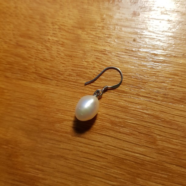 En perleøredobb som nå dessverre er helt alene i verden, etter at jeg klarte å miste den andre. (Jeg tok dette bildet og sendte det til hittegods-folka der jeg var da den forsvant, men de fant den ikke.) Jeg synes at størrelsen på disse var helt optimal, så om noen ser noe til forveksling likt et sted, si gjerne ifra!