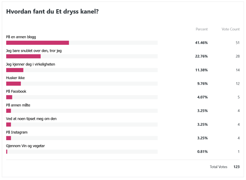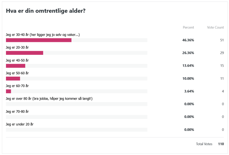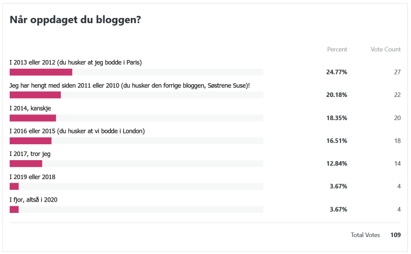 Nå er det på tide å ta en titt på resultatet av leserundersøkelsen! Det er mer enn hundre stykker som har tatt seg tid til å svare, og det setter jeg veldig stor pris på. Tusen takk til hver og én av dere!