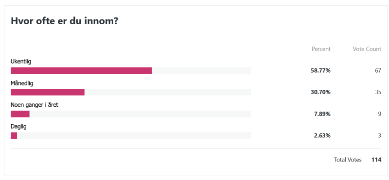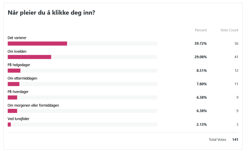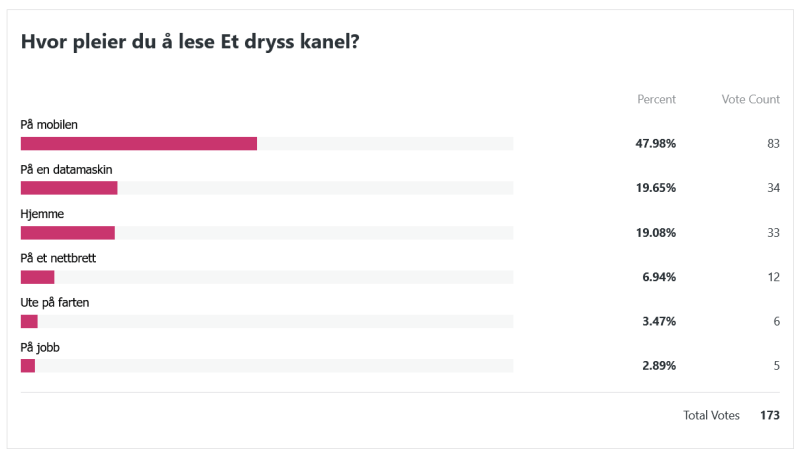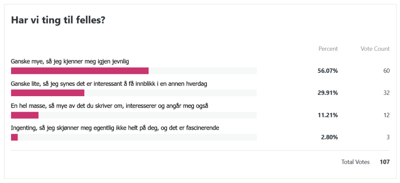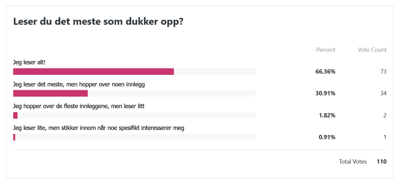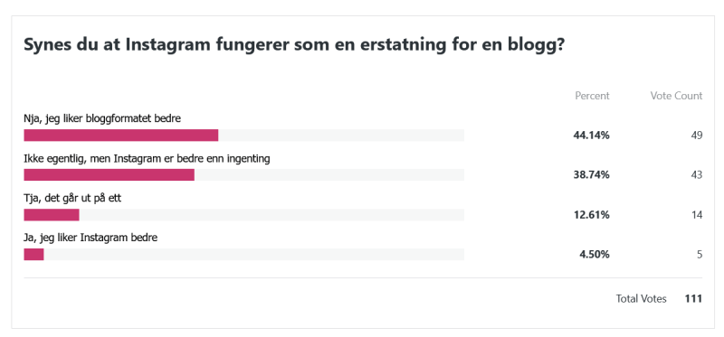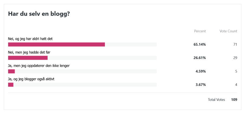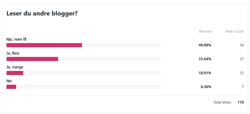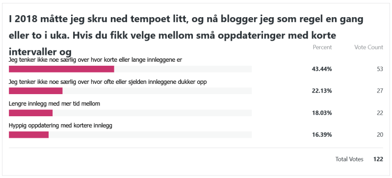 Her var spørsmålet i lengste laget, haha. Den siste setningen låt som følger: «Hvis du fikk velge mellom små oppdateringer med korte intervaller og lengre innlegg som kom sjeldnere, hva ville du foretrekke?» Disse svarene var også en liten lettelse å se. Jeg var litt redd for at alle skulle si at de ville ha hyppigere oppdateringer, men så ble det svaraltenativet det minst brukte. Det er kanskje ikke så rart at den som tenker mest over hvor lange innleggene er og hvor ofte de dukker opp, er meg selv. Jeg er en sånn person som liker at ting er jevnt fordelt og godt strukturert, haha!