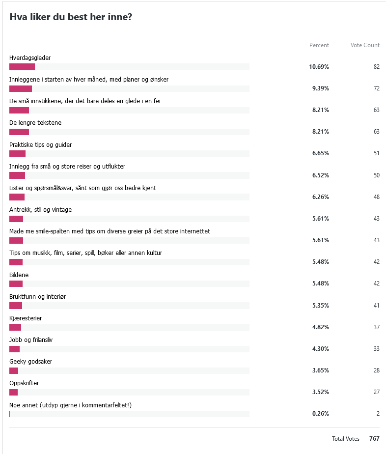 Her var det hyggelig med så mange svar! I gjennomsnitt har folk brukt sju av svaralternativene hver, det er fint å se. Jeg noterer meg at dere er åpne for flere små innstikk og flere lister – det er fint å kunne dele slike småting i travle perioder. Det er også kjekt at såpass mange setter pris på de månedlige innleggene med planer. Nå har jeg startet hver måned med et slikt innlegg i seks og et halvt år, så det er blitt en kjær vane for min egen del også!