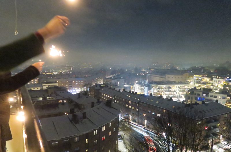Ved midnatt var vi litt usikre på om vi skulle gå ut eller ikke, og sikten var såpass dårlig at vi besluttet å bli inne. Balkongen vår er uansett et fint sted for å stå og se på fyrverkeriet! Etterpå tente vi stjerneskudd, og alle var glade for å kunne legge 2021 bak seg.