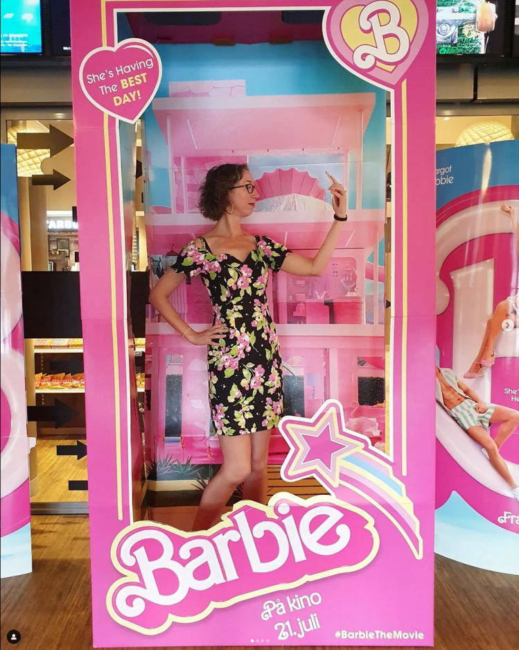 (Kunne forresten ikke dy meg da vi gikk på kino for å se Barbie-filmen, hoho! En perfekt anledning til å bruke en kjole jeg har fått av en venn av familien, som kjøpte den i Florida på 90-tallet. Vanligvis er den ikke helt min stil, men den er jo helt Barbie!)